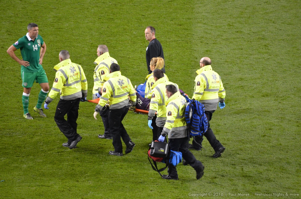 Am Abend stand dann mit der „Bitburger EM-Qualifikationsparty“ das Highlight der Reise auf dem Programm. Dass man die Abfahrt der Bitburger Fan Force One® Busflotte zum Aviva Stadium auf lediglich 2 Stunden vor Anpfiff legte, stellte sich im Nachhinein als kleiner Kritikpunkt heraus. Zu Fuß ist das Aviva Stadium nur ca. 2 km bzw. 30 Minuten vom The Gibson Hotel entfernt. Für den etwas längeren Busweg benötigte man aufgrund von extremem Verkehrsaufkommen allerdings über 1 Stunde, sodass man erst ca. 45 Minuten vor Anpfiff im Stadion war. Da wäre der Fußweg die sinnvollere Alternative gewesen, auch im Hinblick auf die Überraschung, die erst im Bus folgte: Es gab keine „normalen“ Tickets, sondern Tickets mit Hospitality Experience, also inklusive Essen & Trinken in der Havelock Lounge. Nach der kleinen Stärkung ging es daher recht zügig auf die Tribüne bzw. den kleinen Balkon, denn die Nationalhymnen und der Anpfiff standen kurz bevor. 50.604 Zuschauer sahen kein überragendes Spiel, aber eine kämpfende irische Mannschaft, die das Spiel durch einen Treffer von Shane Long in der 70. Minute mit 1:0 gewann. Die direkte Qualifikation der DFB-Elf für die UEFA EURO 2016 wurde somit auf den letzten Spieltag vertagt. Im Hotel gab es dann noch einen Mitternachtssnack, der teilweise ähnlich zerfahren war, wie das Spiel unserer Nationalelf, und das ein oder andere Bitburger.