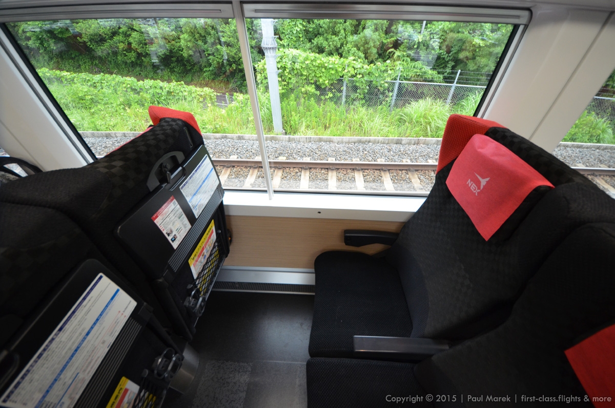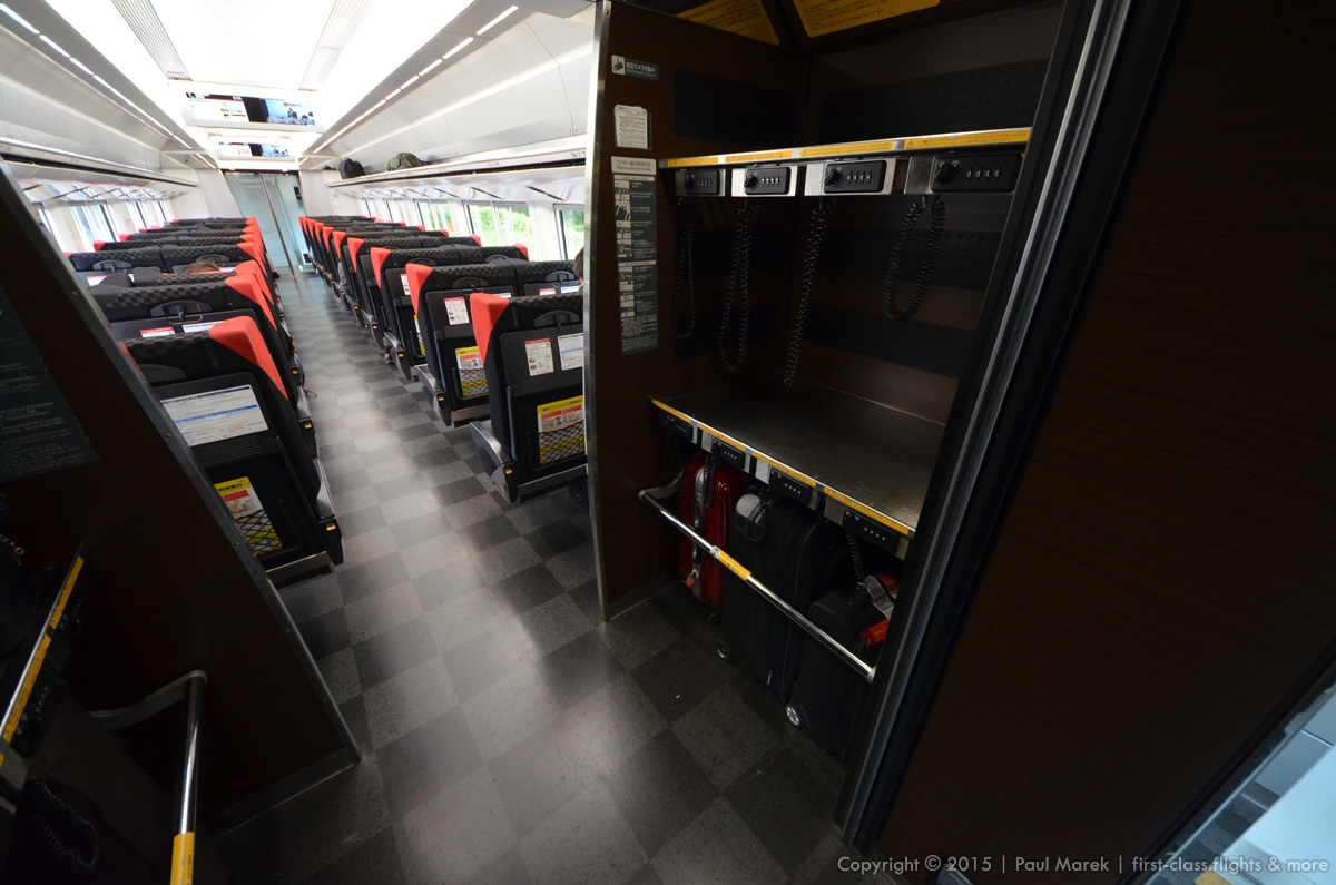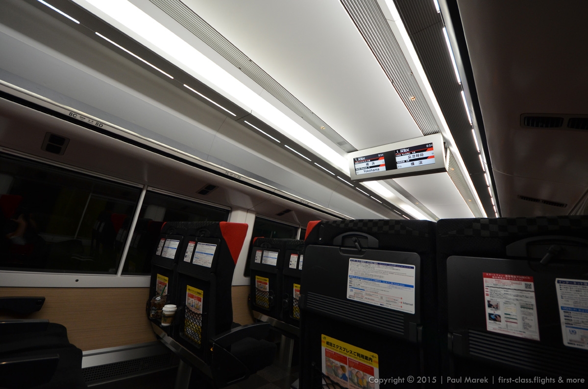 Direkt neben den Türen gab es eine Möglichkeit Gepäck abzustellen und mit einem vierstelligen Zahlenschloss „anzuketten“. Über den Sitzen konnte man auch noch kleineres Gepäck verstauen. Die Sitze boten viel Platz und die Rückenlehne ließ sich neigen, so dass man eine sehr komfortable Sitzposition für die Reise nach Yokohama hatte.